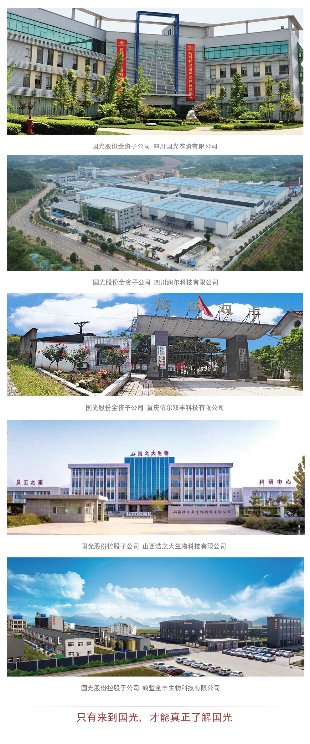 公司下屬的四川國光農資有限公司、四川國光園林科技有限公司、四川潤爾科技有限公司、重慶依爾雙豐科技有限公司、山西浩之大生物科技有限公司、鶴壁全豐生物科技有限公司、四川蕓領農業技術服務有限公司、成都國光現代農業職業技能培訓學校有限公司等十五家公司分布于四川省、山西省、河南省、海南省、重慶市等省(直轄市),并在全國設有二十五個物流倉儲服務中心。公司堅持“敬業、高效、務實、創新”的企業精神,聚焦調節劑、水溶性肥料、園林養護品等優勢品類,堅持“全員服務、創造價值;全心服務,成就用戶”的服務理念,突出技術服務的核心作用,產品在配合綠色防控、提質減量、抗災減害、減少人工、配合機械化等方面起著重要作用,“國光”“雙豐”“浩之大”“國光園林”“鶴壁全豐”品牌影響力持續擴大。
