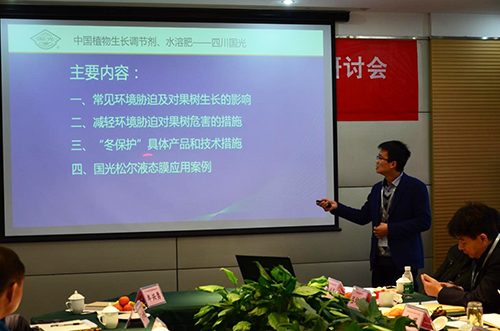 2016年12月3日,由中國農藥發展與應用協會植物生長調節劑專業委員會主辦,國光股份承辦的“植物生長調節劑新應用、果樹冬保護專題研討會”在四川成都召開。全國農業技術推廣服務中心農藥與藥械處處長王鳳樂、中國農藥發展與應用協會副秘書長花榮軍、全國農業技術推廣服務中心防治處高級農藝師李萍、中國農藥發展與應用協會植物生長調節劑專業委員會主任胡興啟、中國農業大學農學院教授、長江學者、植物生長調節劑專家段留生以及四川、河南、山東、江蘇、陜西、福建、湖南、湖北、廣西等省的省植保站站長、省農業科學院、林業科學院的研究員、教授等17人參加研討。