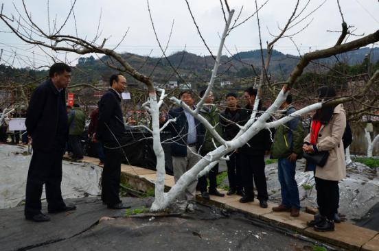 專家領導們在國光“冬保護”桃樹基地觀摩