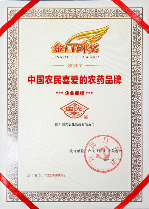 國光榮獲“2017金口碑獎(jiǎng)”,該獎(jiǎng)代表農(nóng)民對(duì)農(nóng)藥品牌的喜愛和真實(shí)的評(píng)價(jià),是目前中國農(nóng)藥行業(yè)有影響力的大獎(jiǎng)之一。