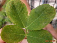癥狀:主要為害花生葉片,初為褪綠小點,后擴展成近圓形或不規則形小斑,病斑較黑斑病大而色淺,葉正面呈暗褐或茶褐色,背面呈褐或黃褐色,病斑周圍有亮黃色暈圈。濕度大進病斑上可見灰褐色粉狀霉層,即病菌分生孢子梗和分生孢子。葉柄和莖稈染病 病斑長橢圓形,暗褐色。