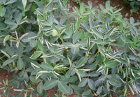 癥狀:(1)葉片:發病,病斑暗褐色,近圓形,直徑3~8毫米,具不明顯輪紋。潮濕時,病斑呈水漬狀軟化腐爛。(2)莖部:莖部發病,病斑初為褐色,后變為深褐色,最后呈黑褐色。造成莖桿軟腐,植株萎蔫枯死。在潮濕條件下,病斑上布滿灰褐色絨毛狀霉狀物和灰白色粉狀物,即病菌菌絲、分生孢子梗和分生孢子;ㄉ鷮⒔斋@時,莖的皮層及木質部之間產生大量小菌核,有時菌核能突破表皮外露。(3)果針:果針受害后,收獲時易斷裂。(4)莢果:莢果受害后變為褐色,在表面或莢果里生白色菌絲體及黑色菌核,引起子粒腐敗或干縮。大菌核病引起癥狀和小菌核病相似,但僅在莖蔓上發生,后期產生菌核較大。